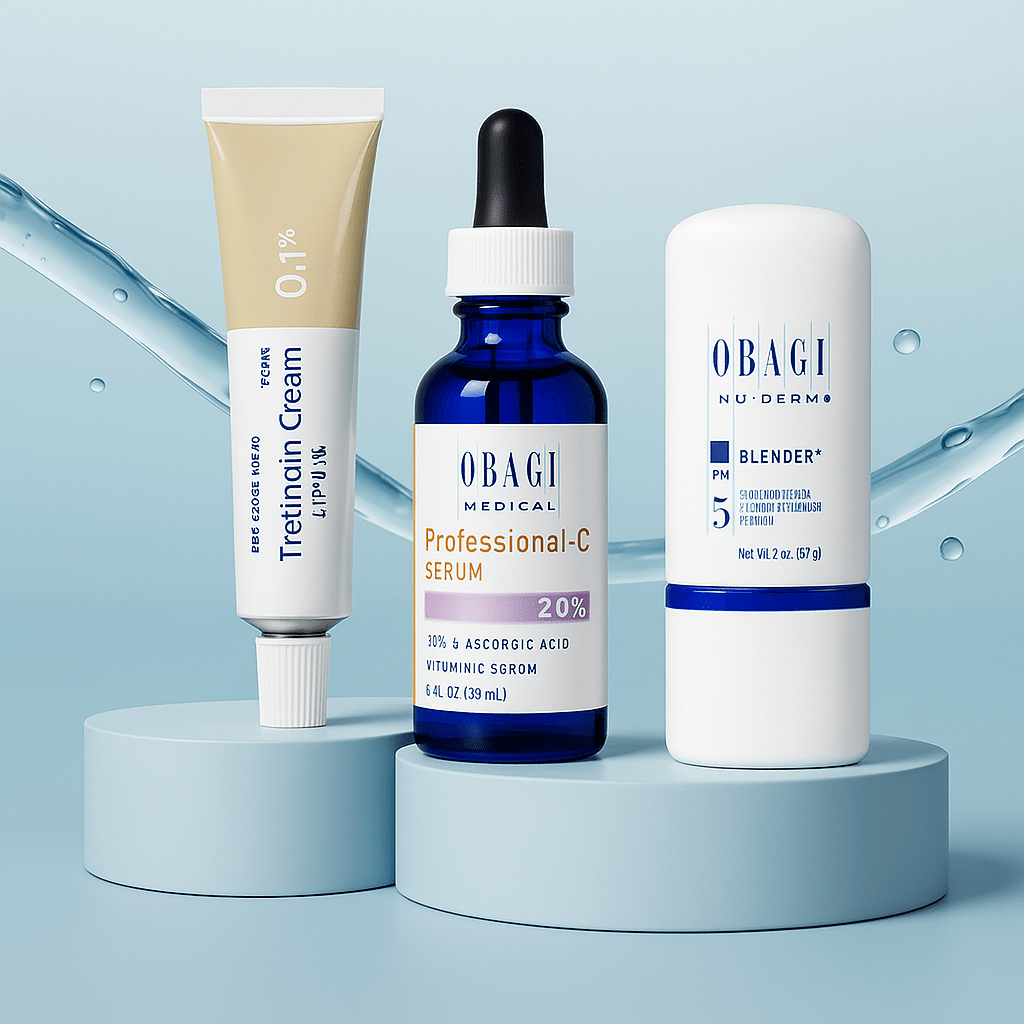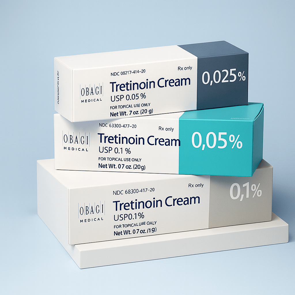 This set incudes all three strenghs of Obagi tretinoin creams for a comprehensive anti-aging routine. We suggest using 0.025% on your neck and chest as the skin there is the most prone to irritation; 0.05% on your face; 0.1% on your hands and feet.